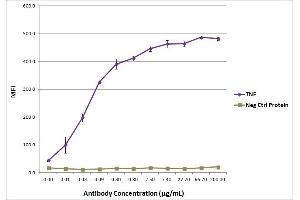 TNF (Tumor Necrosis Factor) is a cytokine that binds to TNFRSF1A/TNFR1 and TNFRSF1B/TNFBR. It is mainly secreted by macrophages and can induce cell death of certain tumor cell lines. It is potent pyrogen causing fever by direct action or by stimulation of interleukin-1 secretion and is implicated in the induction of cachexia, Under certain conditions it can stimulate cell proliferation and induce cell differentiation. TNF antibody (mAb) was raised in a Mouse host. It has been validated for use in ELISA, it has been shown to react with Human samples.