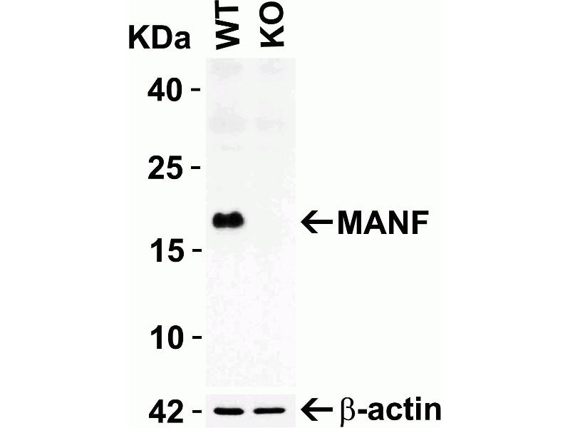 - This antibody does not cross-react with CDNF. The specificity of this antibody was further verified by MANF specific knockout. MANF signal was not detected in MANF knockout HEK293T cells as compared to that in control wild type cells.