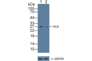 - The antibody is a rabbit polyclonal antibody raised against GCA. It has been selected for its ability to recognize GCA in immunohistochemical staining and western blotting.