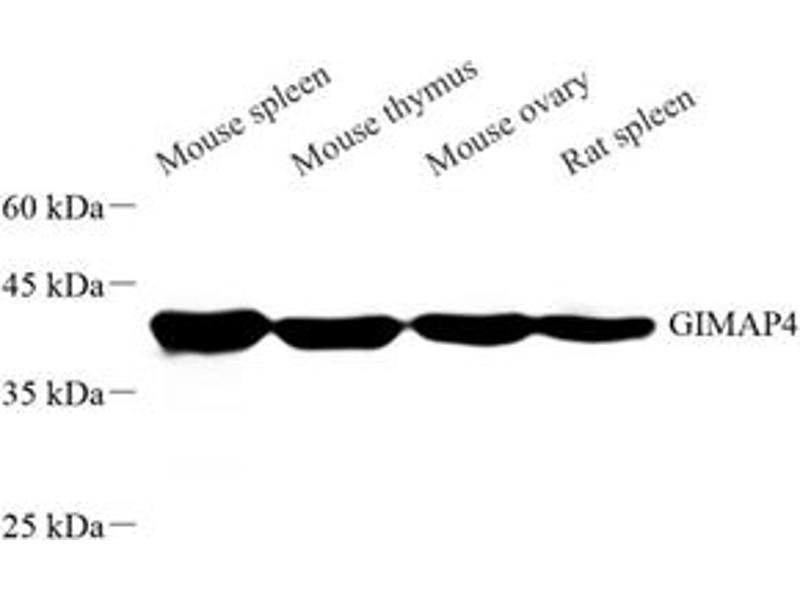 GIMAP4, also named as hIAN1 or HIMAP4, is a member of GIMAP family. Among GIMAP family, GIMAP4 is the only member reported to have true GTPase activity, and its transcription is found to be differentially regulated during early human CD4+ T helper (Th) lymphocyte differentiation. GIMAP4 has been previously connected mainly with T- and B-cell development and survival and T-cell apoptosis.