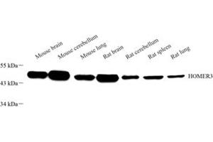 HOMER3 is a member of the HOMER family of postsynaptic density scaffolding proteins that share a similar domain structure consisting of an N-terminal Enabled/vasodilator-stimulated phosphoprotein homology 1 domain which mediates protein-protein interactions, and a carboxy-terminal coiled-coil domain and two leucine zipper motifs that are involved in self-oligomerization. The encoded protein binds numerous other proteins including group I metabotropic glutamate receptors, inositol 1,4,5-trisphosphate receptors and amyloid precursor proteins and has been implicated in diverse biological functions such as neuronal signaling, T-cell activation and trafficking of amyloid beta peptides.