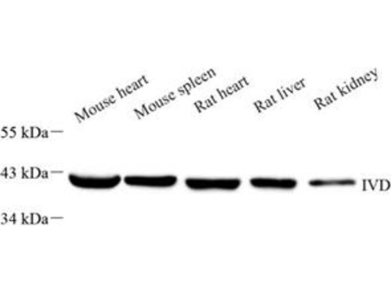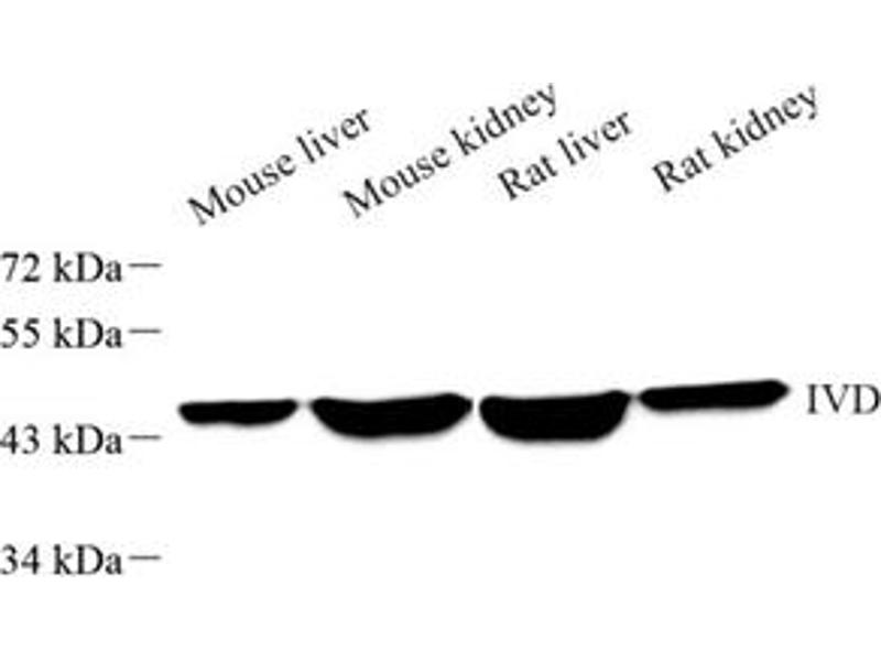 IVD(Isovaleryl CoA dehydrogenase, mitochondrial) is a member of the acylCoA dehydrogenase family and is involved in the catabolism of leucine. In size, IVD precursor and mature proteins produced by class I mutants are indistinguishable from their normal counterparts. Class II, III, and IV mutants make IVD precursor proteins 42 kD in size rather than the normal 45 kD. It has 2 isoforms produced by alternative splicing.
