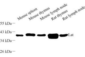 Linker for activation of T-cells family member 1 (LAT) is a single-pass type III membrane protein which is required for TCR (T-cell antigen receptor) and pre-TCR-mediated signaling, both in mature T-cells and during their development This protein is involved in FCGR3 (low affinity immunoglobulin gamma Fc region receptor III)-mediated signaling in natural killer cells and FCER1 (high affinity immunoglobulin epsilon receptor)-mediated signaling in mast cells. Functionally T cell receptor (TCR) activation results in tyrosine phosphorylation of LAT, leading to the direct interaction with several proteins, including PLC-gamma 1, Grb2 and Gads. These direct ligands then mediate the indirect interaction of LAT with proteins such as SLP-76, Vav1 and Itk. PLC-gamma 1, Vav1 and Itk contain pleckstrin homology (PH) domains that interact with the enzymatic product of phosphoinositide-3-kinase (PI3k).