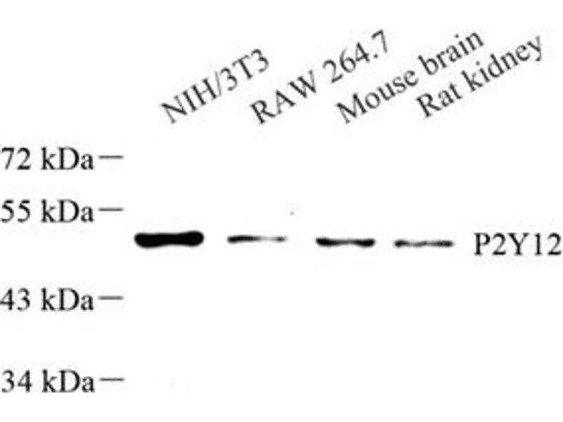 The P2Y receptor family are G protein-coupled receptors which mediate the effects of extracellular nucleotides, primarily through the activation of phospholipase C. To some extent, the P2Y receptors can also activate potassium channels or, alternatively, inhibit adenylate cyclase and N-type calcium channels in response to extracellular nucleotides. Human platelets express two G protein-coupled nucleotide receptors, P2Y1 and P2Y12. P2Y12 is a receptor for ADP and ATP coupled to G-proteins that inhibit the adenylyl cyclase second messenger system. P2Y12 is an integral membrane protein involved in platelet aggregation. It is highly expressed in platelets, with lower levels in the brain, lung, appendix, pituitary and adrenal gland.