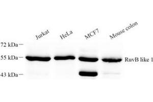 RUVBL1 is a member of the AAA (ATPase associated with diverse cellular activities) family of proteins that is associated with several chromatin-remodelling complexes and has important roles in transcriptional regulation, the DNA damage response, telomerase activity, snoRNP assembly, cellular transformation and cancer metastasis[PMID: 21617703]. It consists of 456 amino acids (50 kDa) and interacts with TATA-binding protein (TBP), which is a central component for transcriptional regulation by forming complexes with various transcription regulators. RUVBL1 is a component of a large nuclear protein complex, possibly the RNA polymerase II holoenzyme.
