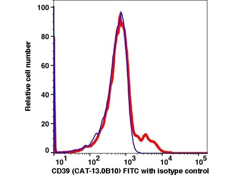 The clone CAT-13.0B10, a mouse monoclonal antibody recognizes a 70 - 100 kDa cell surface antigen known as CD39. It is also known as ATPDase or Ecto-ATP diphosphohydrolase as it has intrinsic Ecto-ATPase activity. CD39 is expressed on peripheral blood B cells and on a subset of T cells, and its expression level increases upon immune activation. The CD4+ CD39+ T cells catalyze cleavage of adenosine triphosphate (ATP) to adenosine monophosphate (AMP), largely overlap with the CD4+ CD25high FOXP3+ regulatory T cells and mediate potent immune suppression. CD39 also plays an important role in immune activation.