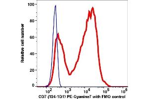 The clone 124-1D1, a mouse monoclonal antibody selectively recognizes ~40 kDa type I transmembrane glycorotein antigen known as CD7. It is a member of Ig superfamily and abundantly expressed on the cell surface of the human T cells and a subset of NK cells. The CD7 is expressed throughout the process of T lymphocyte differentiation and is present on 85 % to 90 % of peripheral blood T cells. It is also expressed on acute lymphocytic leukemia (ALL) and some type of acute myeloid leukemia (AML) cells.