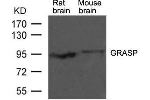 Background: GRASP (GRP1-associated scaffold protein, tamalin) is a 395 amino acid proteinencoded by the human gene GRASP . GRASP is a scaffold protein that com-prises multiple protein-interacting domains, including a 95 kDa postsynaptic density protein (PSD-95)/discs-large/ZO-1 (PDZ) domain, a leucine-zipperregion and a carboxyl-terminal PDZ-binding motif. GRASP is involved with intracellular trafficking and contributes to the macromolecular organization of group 1 metabotropic glutamate receptors (mGluRs) at synapses. GRASP forms a heteromer composed of GRASP , PSCD2 and at least one mGluR-1. It also interacts with PSCD3, mGluR-2, mGluR-3 and mGluR-5. GRASP is highly expressed in brain and has lower levels of expression in lung, heart, embryo, kidney and ovary.
