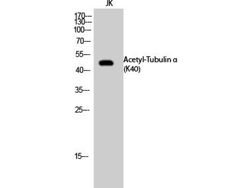 - Rabbit Anti-Tubulin α (Acetyl Lys40) Polyclonal Antibody,TUBA1A, TUBA3, Tubulin alpha-1A chain, Alpha-tubulin 3, Tubulin B-alpha-1, Tubulin alpha-3 chain, TUBA1B, Tubulin alpha-1B chain, Alpha-tubulin ubiquitous, Tubulin K-alpha-1, Tubulin alpha-ubiquitous chain, TUBA1C, TUBA6,Tubulin alpha-6 chain, TUBA3C, TUBA2, TUBA3D, Tubulin alpha-3C/D chain, Alpha-tubulin 2, Alpha-tubulin 3C/D, Tubulin alpha-2 chain, TUBA4A, TUBA1, Tubulin alpha-4A chain, Alpha-tubulin 1, Testis-specific alpha-tubulin,Microtubules of the eukaryotic cytoskeleton perform essential and diverse functions and are composed of a heterodimer of alpha and beta tubulins. The genes encoding these microtubule constituents belong to the tubulin superfamily, which is composed of six distinct families. Genes from the alpha, beta and gamma tubulin families are found in all eukaryotes. The alpha and beta tubulins represent the major components of microtubules, while gamma tubulin plays a critical role in the nucleation of microtubule assembly. There are multiple alpha and beta tubulin genes, which are highly conserved among species. TUBA1A encodes alpha tubulin and is highly similar to the mouse and rat Tuba1 genes. Northern blotting studies have shown that TUBA1A expression is predominantly found in morphologically differentiated neurologic cells. TUBA1A is one of three alpha-tubulin genes in a cluster on chromosome 12q. Mutations in TUBA1A cause lissencephaly type 3 (LIS3) - a neurological condition characterized by microcephaly, mental retardation, and early-onset epilepsy and caused by defective neuronal migration. Alternative splicing results in multiple transcript variants encoding distinct isoforms.,Tubulin alpha-1A chain