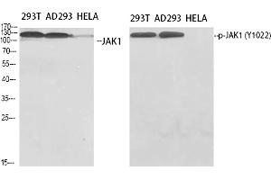 Rabbit Anti-JAK1 (phospho Tyr1022) Polyclonal Antibody,JAK1, JAK1A, JAK1B, Tyrosine-protein kinase JAK1, Janus kinase 1, JAK-1,JAK1 encodes a membrane protein that is a member of a class of protein-tyrosine kinases (PTK) characterized by the presence of a second phosphotransferase-related domain immediately N-terminal to the PTK domain. The encoded kinase (Janus kinase 1) phosphorylates STAT proteins (signal transducers and activators of transcription) and plays a key role in interferon-alpha/beta and interferon-gamma signal transduction. Alternative splicing results in multiple transcript variants.,Tyrosine-protein kinase JAK1