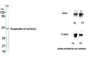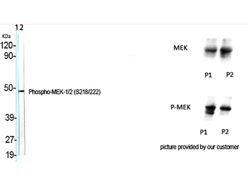 - Phospho-MEK-1/2 (S218/222) Polyclonal Antibody detects endogenous levels of MEK-1/2 protein only when phosphorylated at S218/222.