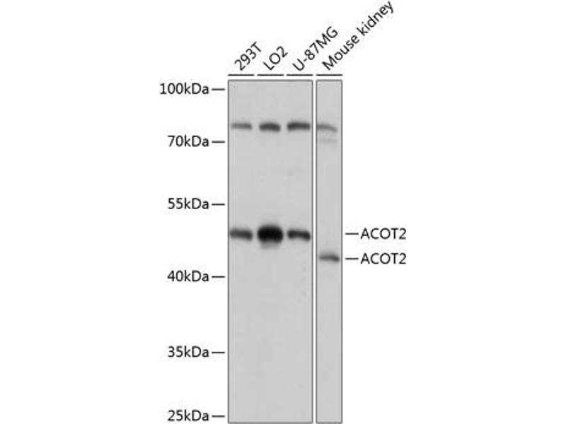 This gene encodes a member of the acyl-CoA thioesterase protein family, and is one of four acyl-CoA hydrolase genes located in a cluster on chromosome 14. Alternative splicing results in multiple transcript variants.,ACOT2,CTE-IA,CTE1A,MTE1,PTE2,PTE2A,ZAP128,Cancer,Signal Transduction,Endocrine & Metabolism,Mitochondrial metabolism,Mitochondrial markers,Lipid Metabolism,Cardiovascular,Lipids,Fatty Acids,ACOT2