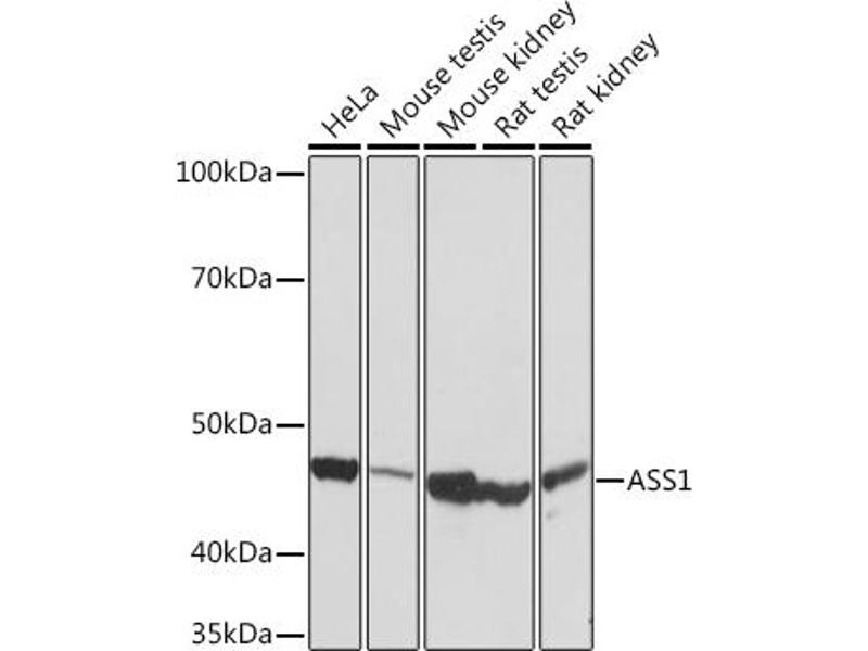 The protein encoded by this gene catalyzes the penultimate step of the arginine biosynthetic pathway. There are approximately 10 to 14 copies of this gene including the pseudogenes scattered across the human genome, among which the one located on chromosome 9 appears to be the only functional gene for argininosuccinate synthetase. Mutations in the chromosome 9 copy of this gene cause citrullinemia. Two transcript variants encoding the same protein have been found for this gene. [provided by RefSeq, Aug 2012],ASS, CTLN1,Amino acid metabolism,Cancer,Endocrine & Metabolism,Epigenetics & Nuclear Signaling,RNA Binding,Signal Transduction,ASS1