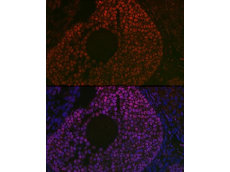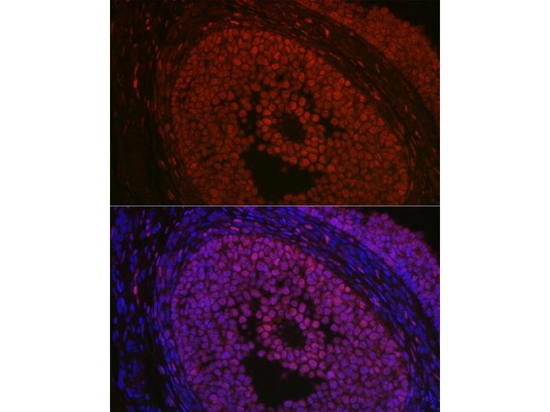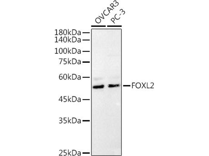 This gene encodes a forkhead transcription factor. The protein contains a fork-head DNA-binding domain and may play a role in ovarian development and function. Expansion of a polyalanine repeat region and other mutations in this gene are a cause of blepharophimosis syndrome and premature ovarian failure 3.,FOXL2,BPES,BPES1,PFRK,PINTO,POF3,Epigenetics & Nuclear Signaling,Transcription Factors,Cell Biology & Developmental Biology,Apoptosis,FOXL2