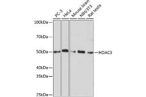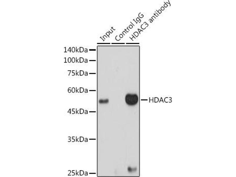 Histones play a critical role in transcriptional regulation, cell cycle progression, and developmental events. Histone acetylation/deacetylation alters chromosome structure and affects transcription factor access to DNA. The protein encoded by this gene belongs to the histone deacetylase/acuc/apha family. It has histone deacetylase activity and represses transcription when tethered to a promoter. It may participate in the regulation of transcription through its binding with the zinc-finger transcription factor YY1. This protein can also down-regulate p53 function and thus modulate cell growth and apoptosis. This gene is regarded as a potential tumor suppressor gene. [provided by RefSeq, Jul 2008],HD3,RPD3,RPD3-2,HDAC3,Apoptosis,Cancer,Cardiovascular,Cell Biology & Developmental Biology,Cell Cycle,Endocrine & Metabolism,Epigenetics & Nuclear Signaling,G1/S Checkpoint,Heart,Heart_Hypertrophy,Immunology & Inflammation,Lipid Metabolism,Lipids,NF-kB Signaling Pathway,Notch Signaling Pathway,Nuclear Receptor Signaling,Signal Transduction,Stem Cells,Tumor suppressors,Wnt/β-Catenin Signaling Pathway,HDAC3