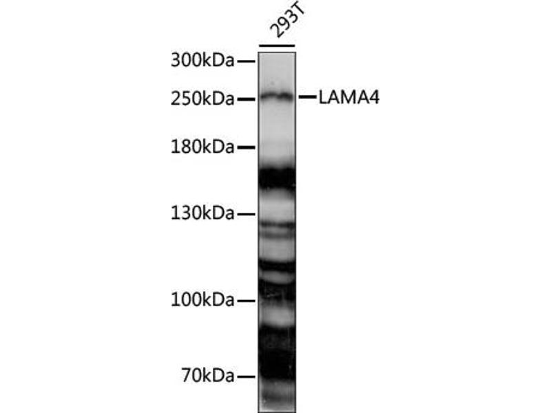 Laminins, a family of extracellular matrix glycoproteins, are the major noncollagenous constituent of basement membranes. They have been implicated in a wide variety of biological processes including cell adhesion, differentiation, migration, signaling, neurite outgrowth and metastasis. Laminins are composed of 3 non identical chains: laminin alpha, beta and gamma (formerly A, B1, and B2, respectively) and they form a cruciform structure consisting of 3 short arms, each formed by a different chain, and a long arm composed of all 3 chains. Each laminin chain is a multidomain protein encoded by a distinct gene. Several isoforms of each chain have been described. Different alpha, beta and gamma chain isomers combine to give rise to different heterotrimeric laminin isoforms which are designated by Arabic numerals in the order of their discovery, i.e. alpha1beta1gamma1 heterotrimer is laminin 1. This gene encodes the alpha chain isoform laminin, alpha 4. The domain structure of alpha 4 is similar to that of alpha 3, both of which resemble truncated versions of alpha 1 and alpha 2, in that approximately 1,200 residues at the N-terminus (domains IV, V and VI) have been lost. Laminin, alpha 4 contains the C-terminal G domain which distinguishes all alpha chains from the beta and gamma chains. The RNA analysis from adult and fetal tissues revealed developmental regulation of expression, Tissue-specific utilization of alternative polyA-signal has been described in literature.,LAMA4,CMD1JJ,LAMA3,LAMA4*-1,Signal Transduction,Cell Biology & Developmental Biology,Cell Adhesion,Cytoskeleton,Extracellular Matrix,Neuroscience,LAMA4