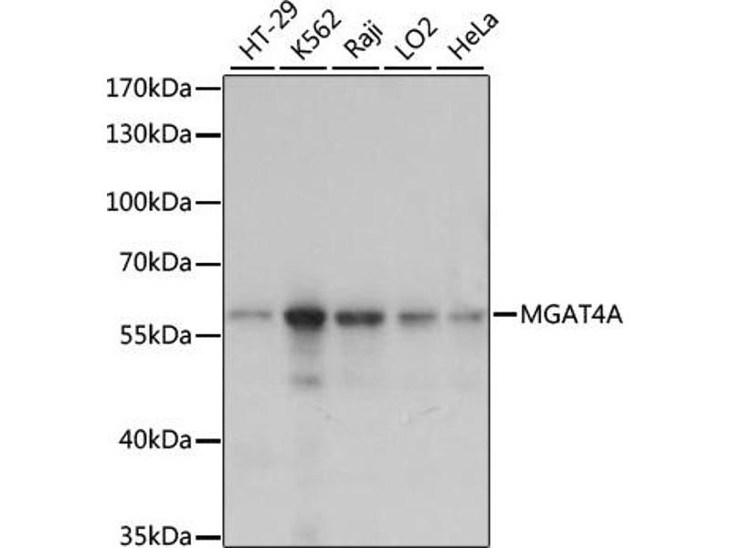 This gene encodes a key glycosyltransferase that regulates the formation of tri- and multiantennary branching structures in the Golgi apparatus. The encoded protein, in addition to the related isoenzyme B, catalyzes the transfer of N-acetylglucosamine (GlcNAc) from UDP-GlcNAc in a beta-1,4 linkage to the Man-alpha-1,3-Man-beta-1,4-GlcNAc arm of R-Man-alpha-1,6(GlcNAc-beta-1,2-Man-alpha-1,3)Man-beta-1, 4-GlcNAc-beta-1,4-GlcNAc-beta-1-Asn. The encoded protein may play a role in regulating the availability of serum glycoproteins, oncogenesis, and differentiation.,MGAT4A,GNT-IV,GNT-IVA,GnT-4a,alpha-1,Signal Transduction,Endocrine & Metabolism,Carbohydrate metabolism,Endocrine and metabolic diseases,Diabetes,MGAT4A