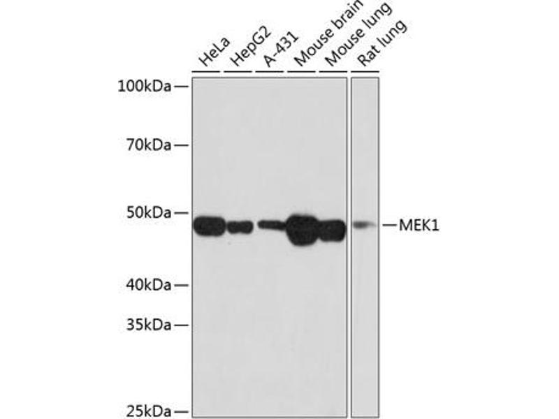 The protein encoded by this gene is a member of the dual specificity protein kinase family, which acts as a mitogen-activated protein (MAP) kinase kinase. MAP kinases, also known as extracellular signal-regulated kinases (ERKs), act as an integration point for multiple biochemical signals. This protein kinase lies upstream of MAP kinases and stimulates the enzymatic activity of MAP kinases upon wide variety of extra- and intracellular signals. As an essential component of MAP kinase signal transduction pathway, this kinase is involved in many cellular processes such as proliferation, differentiation, transcription regulation and development. [provided by RefSeq, Jul 2008],CFC3,MAPKK1,MEK1,MKK1,PRKMK1,MAP2K1,Angiogenesis,B Cell Receptor Signaling Pathway,Cardiovascular,Cell Biology & Developmental Biology,Cytoskeleton,Cytoskeleton_Actins,Endocrine & Metabolism,ErbB-HER Signaling Pathway,ESC Pluripotency and Differentiation,G protein signaling,G protein signaling_G-Protein-Coupled Receptors Signaling to MAPK/Erk,IL-6 Receptor Signaling Pathway,Immunology & Inflammation,Insulin Receptor Signaling Pathway,Kinase,Kinase_Tyrosine kinases,MAPK-Erk Signaling Pathway,Neurodegenerative Diseases,Neuroscience,Protein phosphorylation,Signal Transduction,T Cell Receptor Signaling Pathway,Warburg Effect,MAP2K1