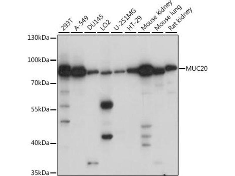 This gene encodes a member of the mucin protein family. Mucins are high molecular weight glycoproteins secreted by many epithelial tissues to form an insoluble mucous barrier. The C-terminus of this family member associates with the multifunctional docking site of the MET proto-oncogene and suppresses activation of some downstream MET signaling cascades. The protein features a mucin tandem repeat domain that varies between two and six copies in most individuals. Multiple variants encoding different isoforms have been found for this gene. A related pseudogene, which is also located on chromosome 3, has been identified.,MUC20,MUC-20,mucin-20,Signal Transduction,Cell Biology & Developmental Biology,Cytoskeleton,Extracellular Matrix,MUC20