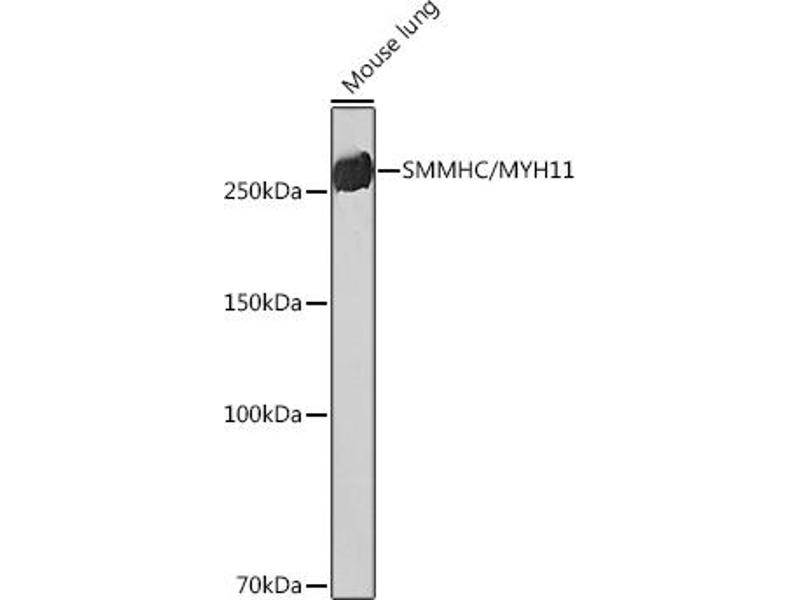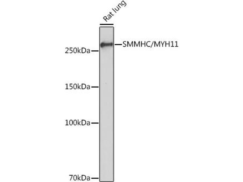 The protein encoded by this gene is a smooth muscle myosin belonging to the myosin heavy chain family. The gene product is a subunit of a hexameric protein that consists of two heavy chain subunits and two pairs of non-identical light chain subunits. It functions as a major contractile protein, converting chemical energy into mechanical energy through the hydrolysis of ATP. The gene encoding a human ortholog of rat NUDE1 is transcribed from the reverse strand of this gene, and its 3' end overlaps with that of the latter. The pericentric inversion of chromosome 16 [inv(16)(p13q22)] produces a chimeric transcript that encodes a protein consisting of the first 165 residues from the N terminus of core-binding factor beta in a fusion with the C-terminal portion of the smooth muscle myosin heavy chain. This chromosomal rearrangement is associated with acute myeloid leukemia of the M4Eo subtype. Alternative splicing generates isoforms that are differentially expressed, with ratios changing during muscle cell maturation. Alternatively spliced transcript variants encoding different isoforms have been identified. [provided by RefSeq, Jul 2008],AAT4, FAA4, SMHC, SMMHC,Cardiovascular,Cardiovascular Markers,Cardiovascular Markers_Smooth Muscle Cells,Cell Biology & Developmental Biology,Cytoskeleton,Cytoskeleton_Motor Proteins,Heart,Heart_Contractility,Signal Transduction,Stem Cells,MYH11