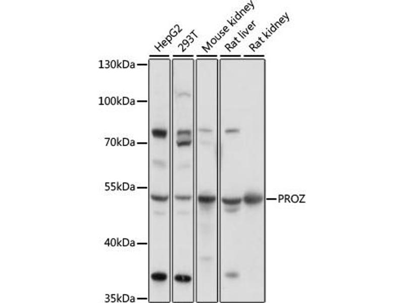 This gene encodes a liver vitamin K-dependent glycoprotein that is synthesized in the liver and secreted into the plasma. The encoded protein plays a role in regulating blood coagulation by complexing with protein Z-dependent protease inhibitor to directly inhibit activated factor X at the phospholipid surface. Deficiencies in this protein are associated with an increased risk of ischemic arterial diseases and fetal loss. Mutations in this gene are the cause of protein Z deficiency. Alternate splicing results in multiple transcript variants.,PROZ,PZ,Cell Biology & Developmental Biology,Ubiquitin,Cardiovascular,Blood,Coagulation,Serum Proteins,PROZ