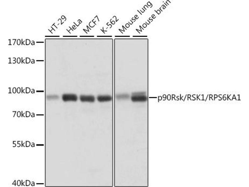 This gene encodes a member of the RSK (ribosomal S6 kinase) family of serine/threonine kinases. This kinase contains 2 nonidentical kinase catalytic domains and phosphorylates various substrates, including members of the mitogen-activated kinase (MAPK) signalling pathway. The activity of this protein has been implicated in controlling cell growth and differentiation. Alternate transcriptional splice variants, encoding different isoforms, have been characterized.,HU-1,MAPKAPK1A,RSK,RSK1,p90Rsk,RPS6KA1,Epigenetics & Nuclear Signaling,Translation Control,Regulation of eIF4 and p70 S6 Kinase,Signal Transduction,G protein signaling,G2/M DNA Damage Checkpoint,Kinase,Serine/threonine kinases,mTOR Signaling Pathway,MAPK-Erk Signaling Pathway,Cell Biology & Developmental Biology,Apoptosis,Mitochondrial Control of Apoptosis,Inhibition of Apoptosis,Cell Cycle,G2/M DNA Damage Checkpoint,Microtubules,Immunology & Inflammation,NF-kB Signaling Pathway,Neuroscience,RPS6KA1
