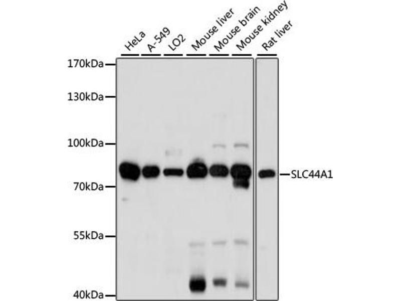 This anti-SLC44A1 antibody is a 兔 多克隆 antibody detecting SLC44A1 in WB. Suitable for 人.