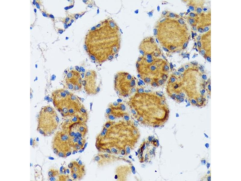 - This gene encodes a membrane-bound glycoprotein. The encoded protein acts as an enzyme and plays a central role in thyroid gland function. The protein functions in the iodination of tyrosine residues in thyroglobulin and phenoxy-ester formation between pairs of iodinated tyrosines to generate the thyroid hormones, thyroxine and triiodothyronine. Mutations in this gene are associated with several disorders of thyroid hormonogenesis, including congenital hypothyroidism, congenital goiter, and thyroid hormone organification defect IIA. Multiple transcript variants encoding distinct isoforms have been identified for this gene, but the full-length nature of some variants has not been determined. [provided by RefSeq, May 2011],MSA, TDH2A, TPX,Cancer,Cell Biology & Developmental Biology,Endocrine & Metabolism,Growth factors,Neuroscience,Signal Transduction,TPO