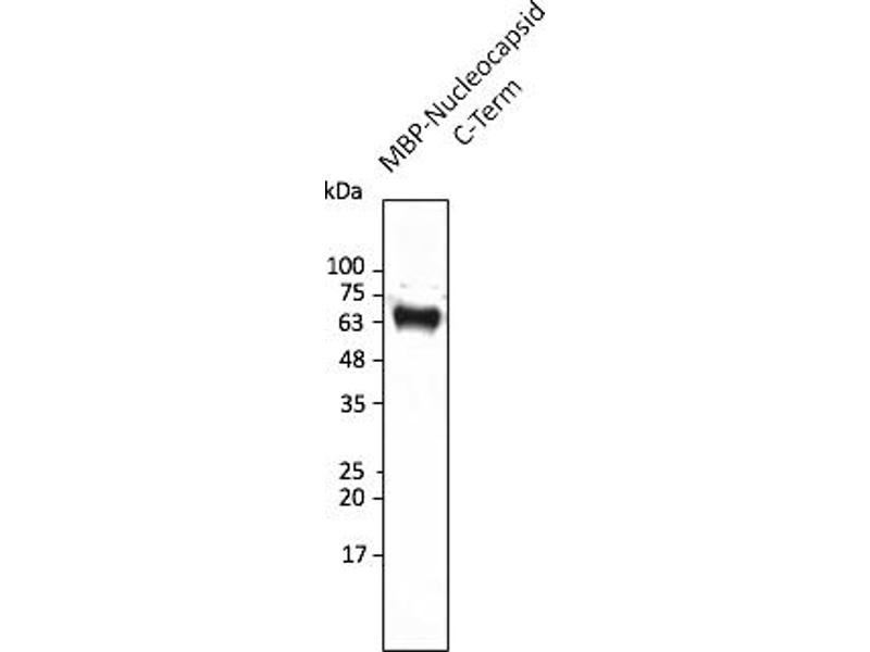 - Affinity purified recombinant fusion protein using the C-terminal of Nucleocapsid (residues 280 to stop) and produced in E. coli