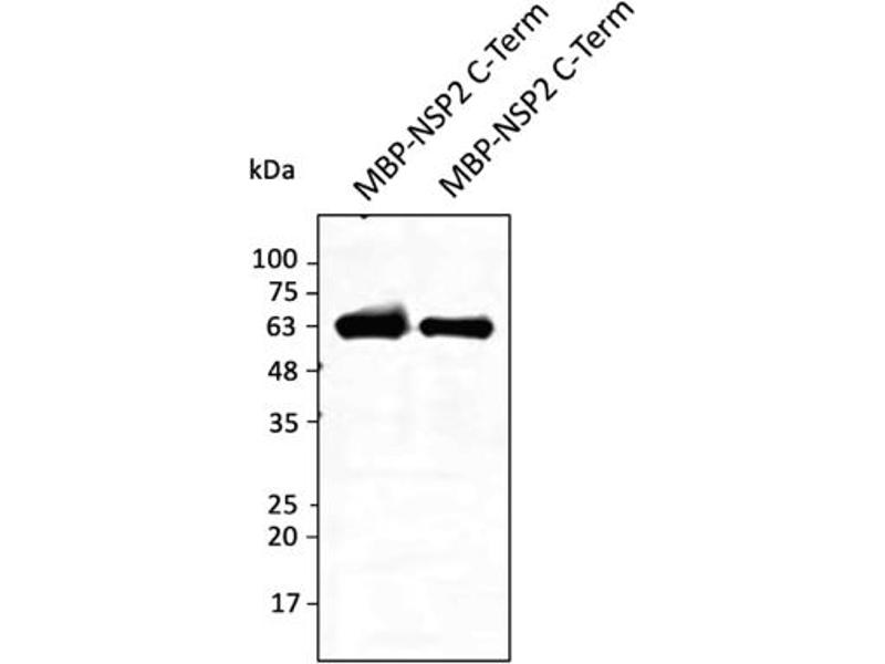 Affinity purified recombinant fusion protein using the C-terminal of Nsp2 (residues 480 to stop) and produced in E. coli.