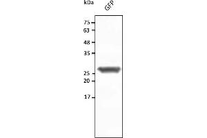 In 293HEK cells transfected with cds plasmid detects a band of 27 kDa by Western blot. This antibody does recognize YFP and CFP and does not recognize RFP and mCherry fluorescent proteins.