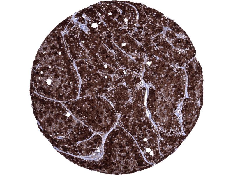 - Manual Protocol: Freshly cut sections should be used (less than 10 days between cutting and staining). Heat-induced antigen retrieval for 5 minutes in an autoclave at 121 °C in pH 7,8 Target Retrieval Solution buffer. Apply the antibody at a dilution of 1:150 at 37 °C for 60 minutes. Visualization of bound antibody by the EnVision Kit (Dako, Agilent) according to the manufacturer's directions.