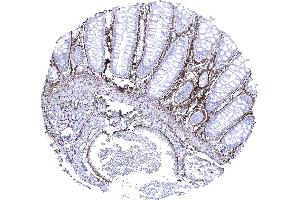 Positive Control: Colon: A moderate to strong elastin immunostaining should be seen of fibres in the lamina propria, around smooth muscle cells of the muscularis mucosae, and in blood vessels (subendothelial).