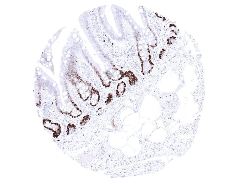 Positive Control: Colon: A strong nuclear MCM3 immunostaining should be seen in virtually all crypt base cells.