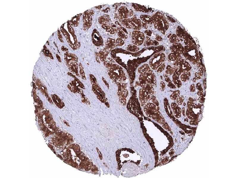 Positive Control: Prostate: The epithelial cells of the prostate glands must show a strong cytoplasmic staining. Due to leakage of the antigen in the vicinity of the prostate glands, adjacent stroma cells may display a weak to moderate staining reaction.