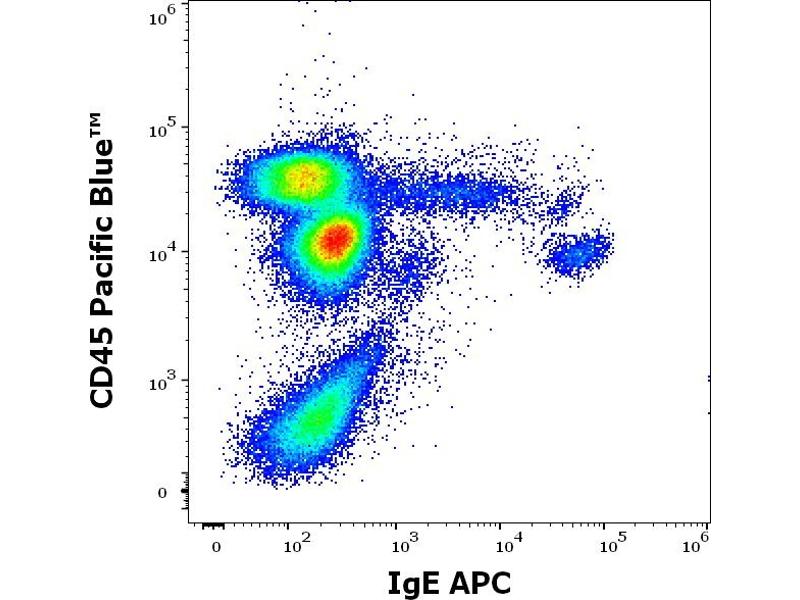 The mouse monoclonal antibody 4H10 reacts with human IgE, it recognizes an epitope different from the ones recognized by BE5 and 4G7.325 antibodies to IgE. The epitope is located within the amino acids 267-279 (TWLEDGQVMDVDL).