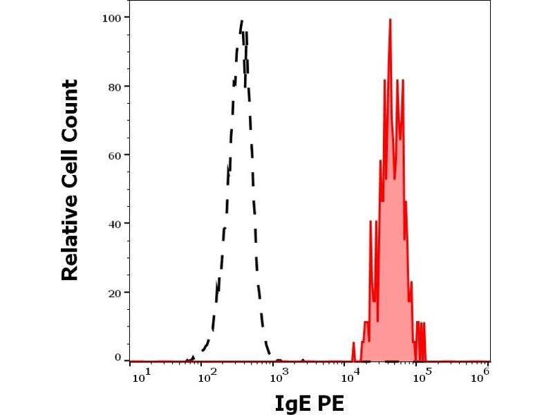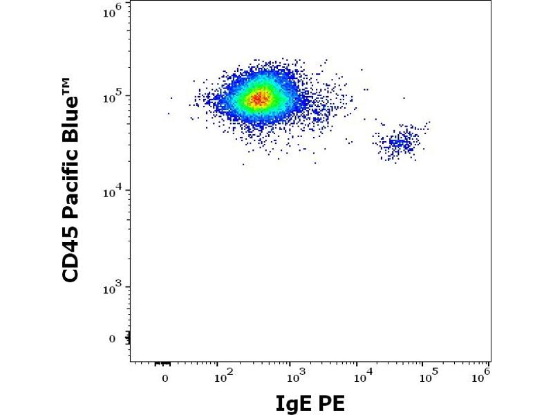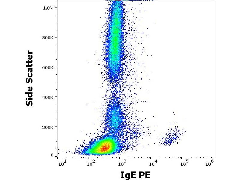 The mouse monoclonal antibody 4H10 reacts with human IgE, it recognizes an epitope different from the ones recognized by BE5 and 4G7.325 antibodies to IgE. The epitope is located within the amino acids 267-279 (TWLEDGQVMDVDL).