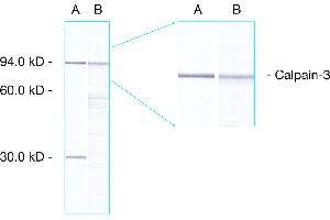 This antibody reacts with full-size calpain 3 (94 kD) plus an additional fragment at 30 kD in human skeletal muscle. A band of 94 kD is seen with rabbit and dog muscle while extracts of hamster muscle show reactivity with the 94 kD band and a larger species of approximately 110 kD. This 110 kD band is the principal immunoreactive species seen in rat muscle extracts. This antibody produces no bands with mouse, pig or chicken muscle.