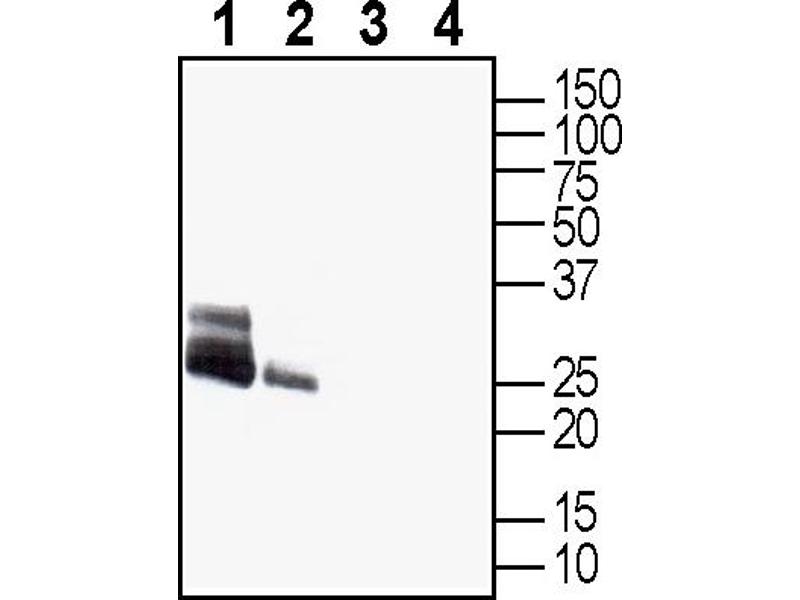 - WCH4, Mercurial-insensitive water channel, MIWC,Aquaporin 4 (AQP-4) belongs to a family of membrane proteins that allow passage of water and certain solutes through biological membranes. The family is composed of 13 members (AQP-0 to AQP-12).The aquaporins can be divided into two functional groups based on their permeability characteristics: the aquaporins that are only permeated by water and the aquaglyceroporins that are permeated by water and other small solutes such as glycerol. AQP-4 together with AQP-1, AQP-2 and AQP-5 belong to the first group1. Little is known about the function of the two newest members, AQP-11 and AQP-12.The proteins present a conserved structure of six transmembrane domains with intracellular N- and C-termini. The functional channel is a tetramer but each subunit has a separate pore and therefore the functional channel unit, contains four pores1.AQP-4 is the major membrane water channel in the central nervous system. The channel is expressed in astrocyte foot processes in direct contact with capillary vessels in the brain suggesting a role in water transport under normal and pathological conditions. Indeed, transgenic mice lacking AQP-4 have reduced brain swelling and improved neurological outcome following water intoxication and focal cerebral ischemia. In contrast, brain swelling and clinical outcome are worse in AQP-4-null mice in models of vasogenic (fluid leak) edema caused by freeze-injury and brain tumor, probably due to impaired AQP-4-dependent brain water clearance2.In addition, it has been recently shown that neuromyelitis optica (NMO), an inflammatory demyelinating disease that selectively affects optic nerves and spinal cord, is caused by the development of an autoantibody directed against AQP-43.