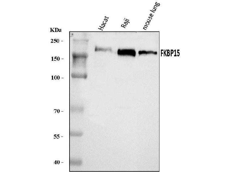 Background: FKBP15, also known as FKBP133, is a member of the FK506-binding protein family, a group of proteins initially identified as immunophilins, targets for the immunosupressant drugs FK506 and Rapamycin. FKBP15 is expressed in the developing nervous system and contains a domain similar to Wiskott-Aldrich syndrome protein homology region 1 (WH1) in addition to the FK506-binding protein motif. FKBP15 is distributed along the axonal shafts and partially co-localizes with F-actin in the growth cones of dorsal root ganglion neurons, overexpression of FKBP15 resulted in the number of filopodia in transfected neurons, suggesting that FKBP15 modulates growth cone behavior. FKBP15 has also been shown to associate with both microtubules and the actin filament systems and disruption of its expression by RNAi resulted in delayed transport of early endosomes in HeLa cells indicating that FKBP15 is also involved in the transport of early endosomes. At least three isoforms of FKBP15 are known to exist.