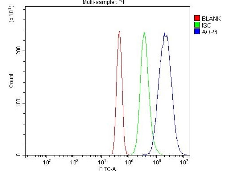 Background: Aquaporin 4 is found in the basolateral cell membrane of principal collecting duct cells and provides a pathway for water to exit these cells. The gene of AQP4 is mapped to 18q11.2-q12.1. Similar to other aquaporins, the AQP4 gene is composed of 4 exons encoding 127, 55, 27, and 92 amino acids separated by introns of 0.8, 0.3, and 5.2 kb. Unlike other aquaporins, an alternative coding initiation sequence (designated exon 0) was located 2.7 kb upstream of exon 1. When spliced together, M1 and the subsequent 10 amino acids are encoded by exon 0, the next 11 amino acids and M23 are encoded by exon 1. AQP4 is expressed in astrocytes and is upregulated by insult to the central nervous system. And AQP4 is the predominant water channel in the brain and has an important role in brain water homeostasis. It is abundant in mammalian brain and is concentrated in astrocytic foot processes at the blood-brain barrier.