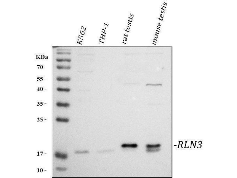 - Anti-RLN3 Antibody (ABIN7600943). Tested in ELISA, Flow Cytometry, WB applications. This antibody reacts with Human, Mouse, Rat. This is a premium antibody that guarantees superior quality, high affinity, and strong signals with minimal background in Western blot applications.