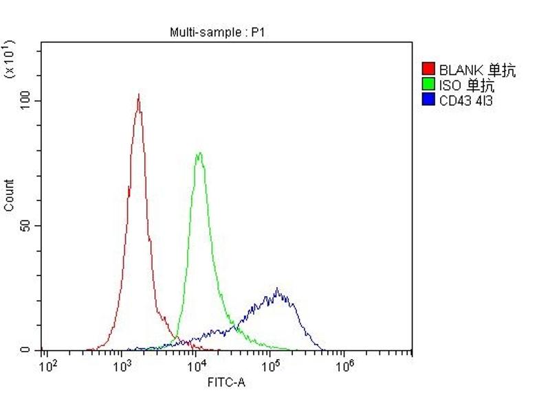 Background: CD43, also known as leukosialin or sialophorin, is a transmembrane cell surface protein that in humans is encoded by the SPN gene. It is mapped to 16p11.2. It is a major sialoglycoprotein on the surface of human T lymphocytes, monocytes, granulocytes, and some B lymphocytes, which is important for immune function and may be part of a physiologic ligand-receptor complex involved in T-cell activation. Expression of CD43 is deficient and/or defective in the X-chromosome-linked immunodeficiency disorder Wiscott-Aldrich syndrome, suggesting that CD43 have a role in T-cell activation. T-cell activation requires the removal of CD43 from the immunologic synapse to allow efficient engagement of the TCR with molecules on the APC.