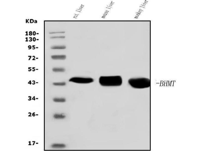 - Anti-BHMT Antibody (ABIN7602515). Tested in ELISA, Flow Cytometry, WB applications. This antibody reacts with Human, Monkey, Mouse, Rat. This is a premium antibody that guarantees superior quality, high affinity, and strong signals with minimal background in Western blot applications.