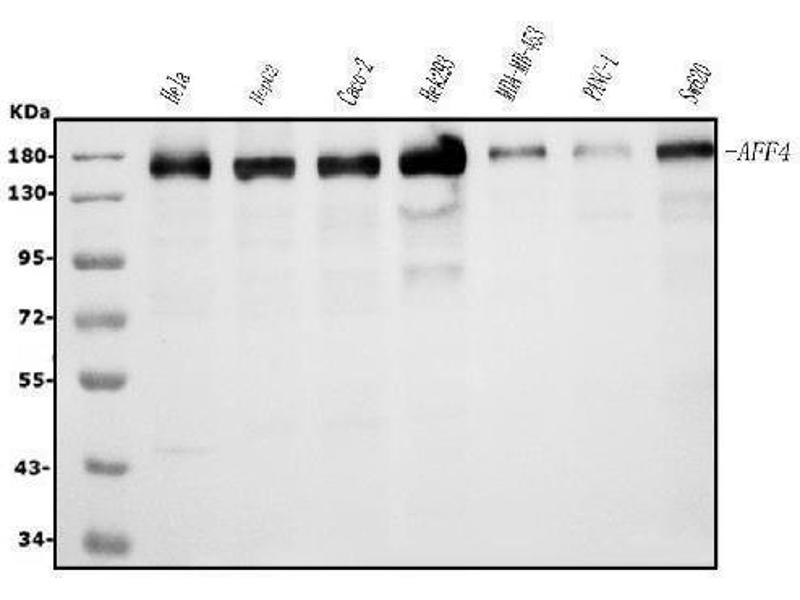 - A synthetic peptide corresponding to a sequence at the N-terminus of human AFF4, identical to the related mouse sequence.