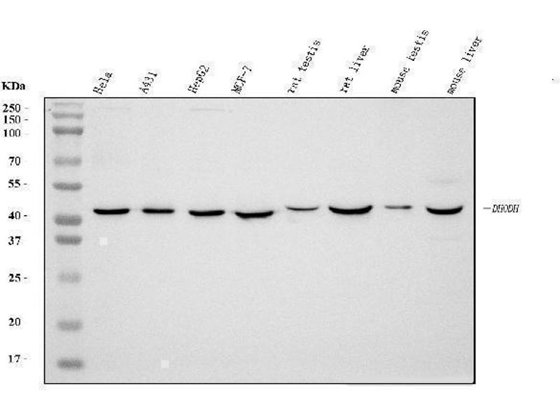 - A synthetic peptide corresponding to a sequence at the N-terminus of human DHODH, different from the related mouse sequence by four amino acids, and from the related rat sequence by two amino acids.