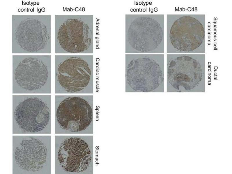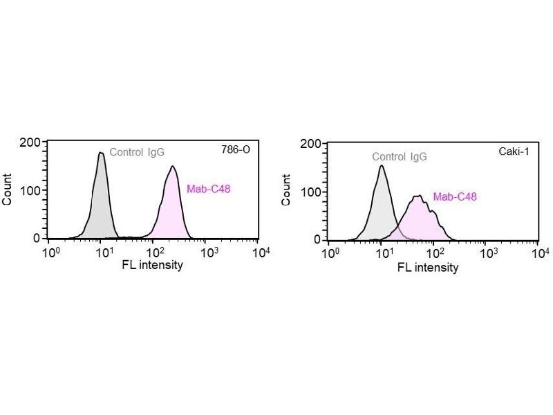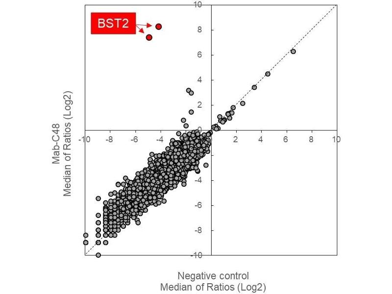 - Mouse monoclonal antibody Mab-C48 recognizes the dimer structure of BST2/Tetherin established by whole-cell immunization of two renal cancer cell lines mixture, 786-O and Caki-1 cells to mice.