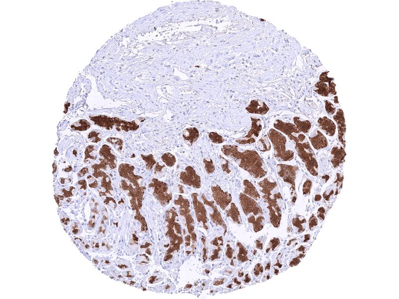Positive Control: Stomach, corpus: A strong pepsinogen-I should be seen in chief cells of the stomach while surface epithelial cells and stroma cells remain negative.