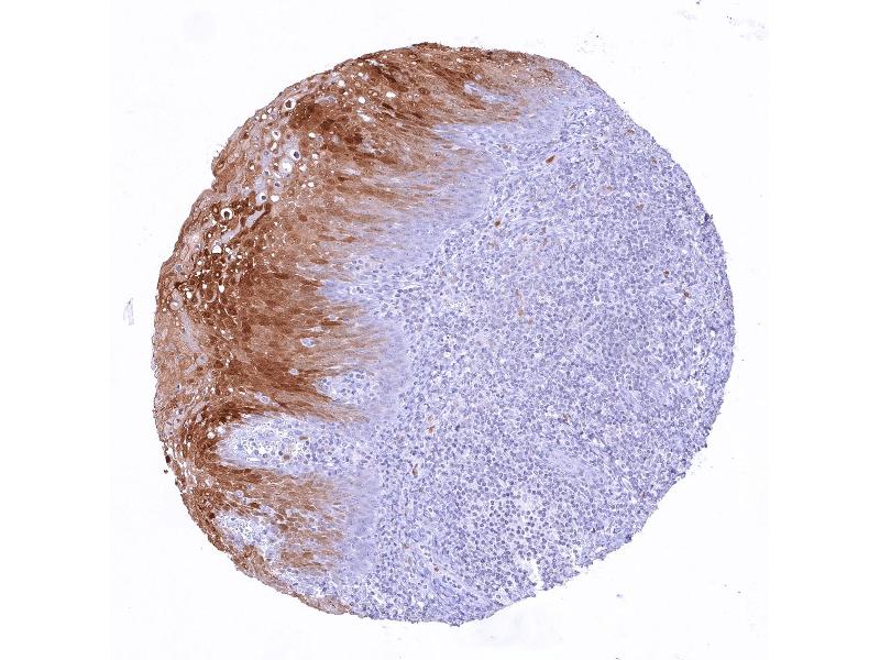Positive Control: Tonsil: A strong cytoplasmic and nuclear PAI2 staining must be seen in a large fraction of squamous epithelial cells.