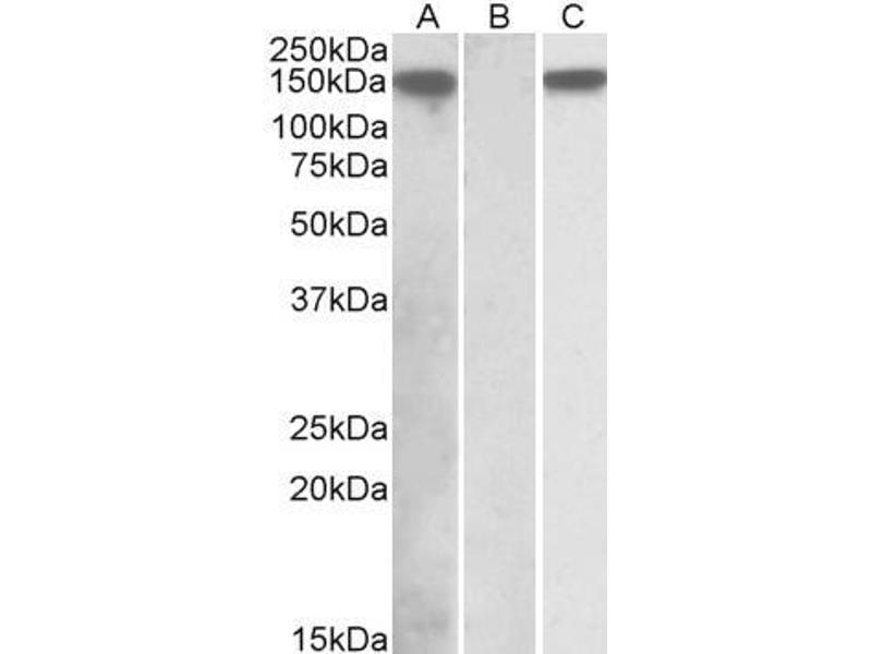 Western Blot: In transfected HEK293 transiently expressing full-length Human NLRP2 (myc and DYKDDDDK tagged), a band of approx. 150 kDa was observed. No bands were observed in mock-transfected HEK293 and the same band was observed using anti-DYKDDDDK tag